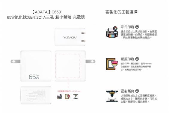 【ADATA】G653 65W氮化鎵(GaN)2C1A三孔 超小體積 充電器