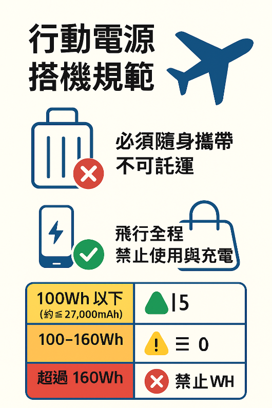 攜帶行動電源搭飛機,務必遵守航空公司的規定,主要重點包含:必須隨身攜帶,不可託運;容量限制100Wh以下可自由攜帶,超過100Wh但未滿160Wh需經航空公司許可,超過160Wh則禁止攜帶;飛行中禁止使用或充電。