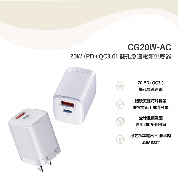 CG20W-AC - 20W(PD+QC3.0)雙孔急速電源供應器
