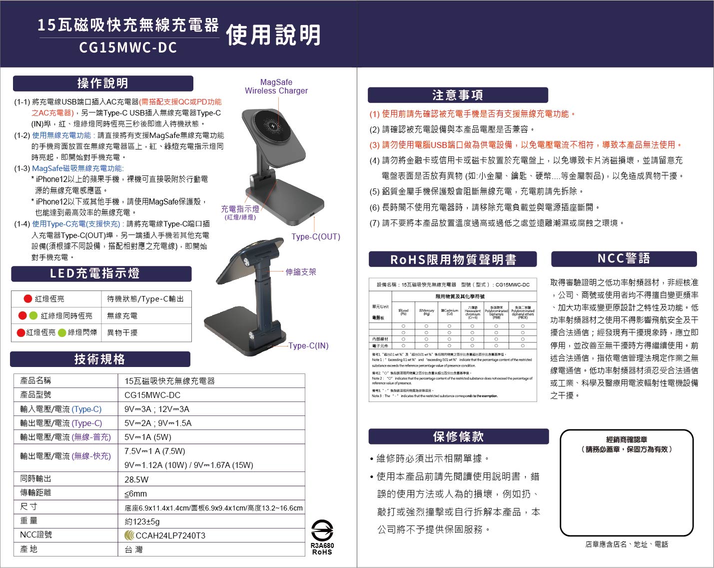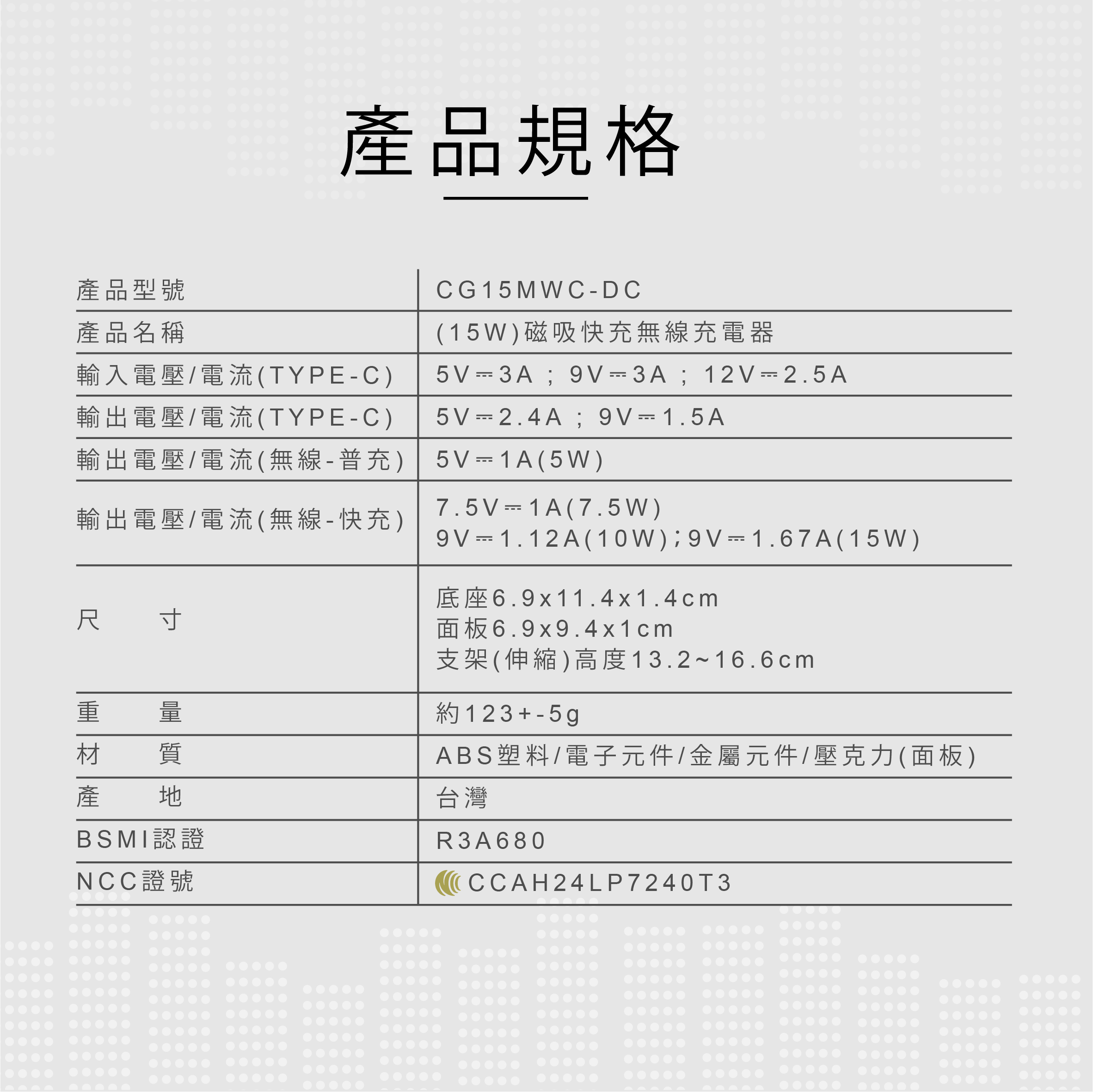 CG15MWC-DC - 全新三代磁吸折疊 無線充電支架 • 磁吸MagSafe無線充電 • 可另接Type-C充電線快速充電 • 摺疊攜帶好方便 另有客製化印刷服務←點此可看更多資訊!歡迎詢問! 更多其他產品 客製化印刷