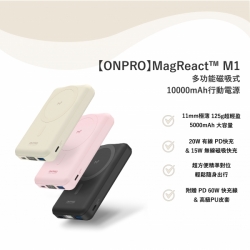【ONPRO】MagReact™ M1 - 多功能磁吸式10000mAh行動電源 • 磁吸設計 • 超大容量 • 馬卡龍色系 另有客製化印刷服務 點此可看更多資訊! Read More 更多其他產品 客製化案例