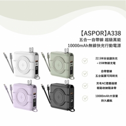 【ASPOR】A338 - 五合一自帶線 超級萬能10000mah行動電源 • 超級萬能 • 自帶雙線+支援無線充電 • 同時輸出五台設備 另有客製化印刷服務 點此可看更多資訊!歡迎詢問! Read More 更多其他產品 客製化案例