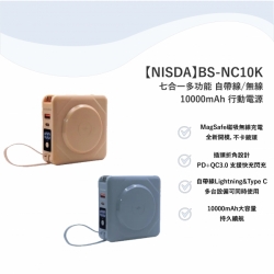 【NISDA】BS-NC10K - 七合一多功能 自帶線/無線 行動電源 • 超級萬能七合一 • Megasafe一吸即充 • 五台設備同時充 • 摺疊插頭 支架支撐 另有客製化印刷服務 點此可看更多資訊! Read More 更多其他產品 客製化案例