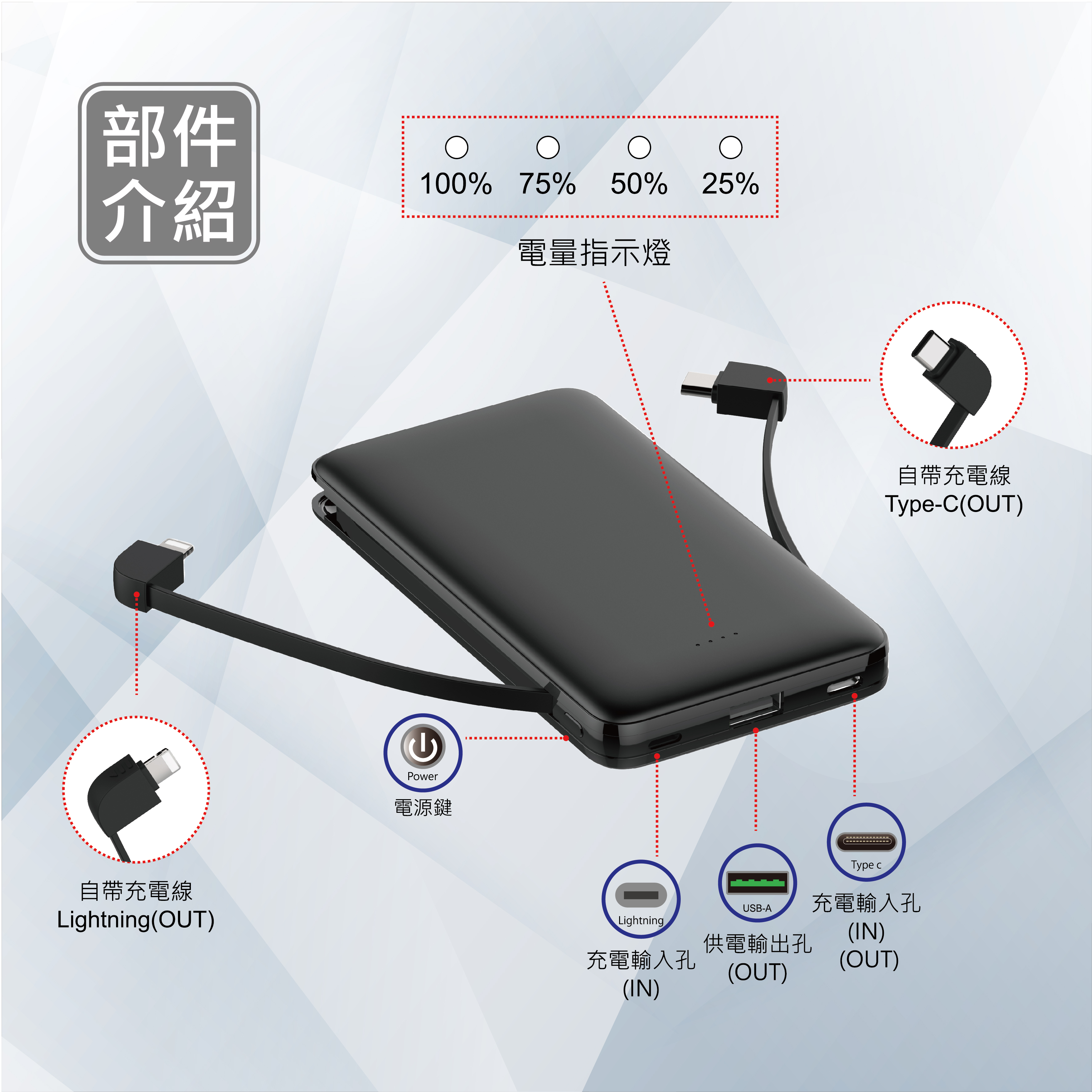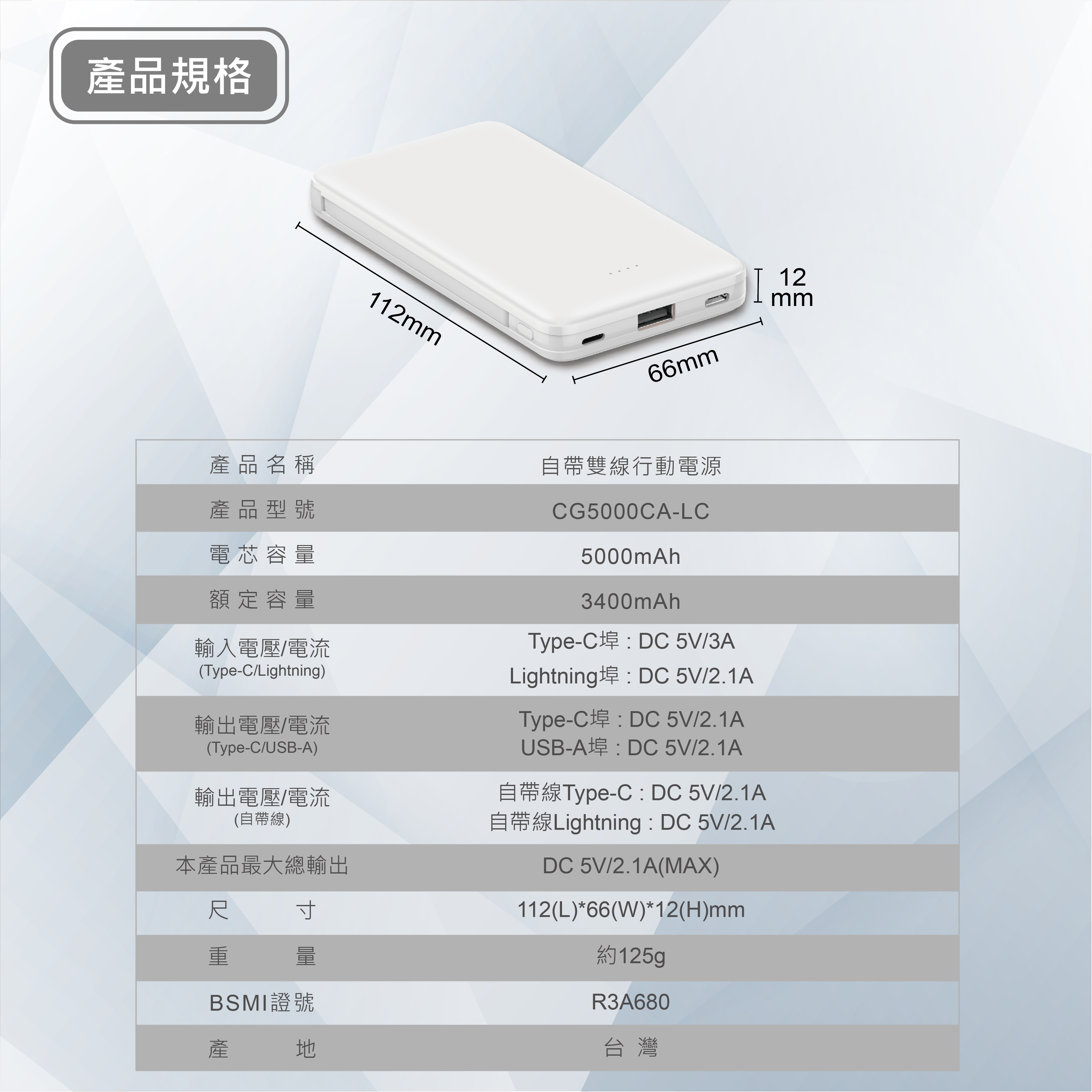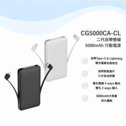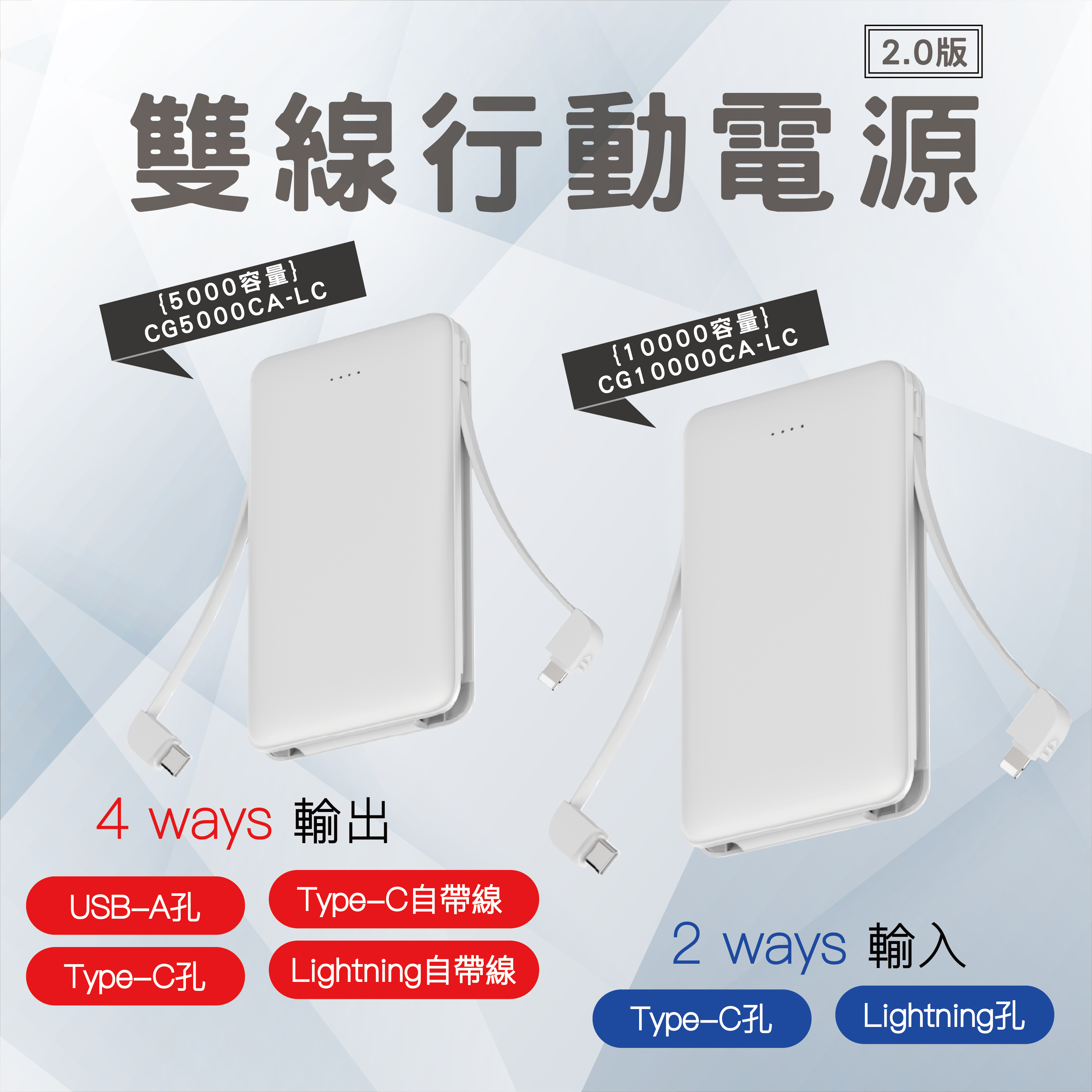 CG5000CA-CL - 二代自帶雙線行動電源 • 充電線完美收合 • 智能晶片 六大安全防護 • Type-C & Lightning 輸入 另有客製化印刷服務 點此可看更多資訊!歡迎詢問! 更多其他產品 客製化印刷