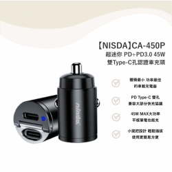 【NISDA】CA-450P - 超迷你 PD + PD3.0 45W 雙Type-C孔認證車充頭 • 隱型車充 不占空間 • 多種設備 隨插即充 • 兼容各種車型 另有客製化印刷服務←點此可看更多資訊!歡迎詢問! 更多其他產品 客製化案例