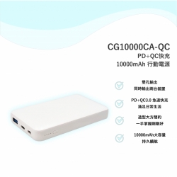 CG10000CA-QC - PD+QC快充 10000mAh行動電源 • 大方簡約 一手掌握剛剛好 • PD雙孔輸出 同時輸出兩台裝置 • 急速充電 另有客製化印刷服務 點此可看更多資訊! 更多其他產品 客製化印刷